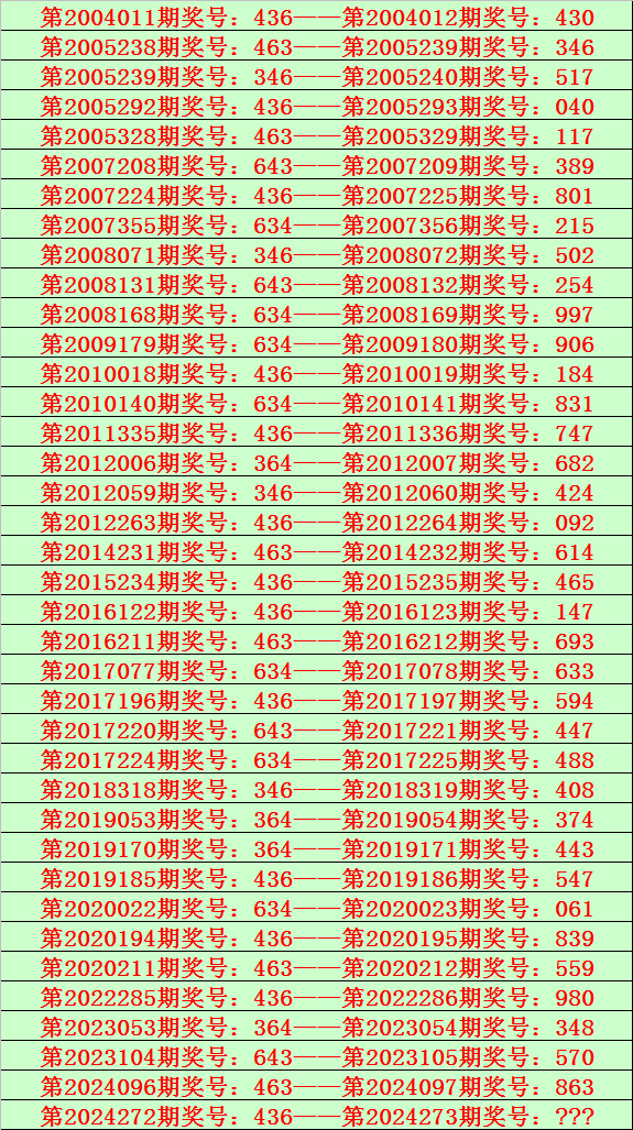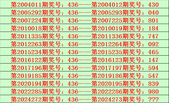 排列三第2024272期开出奖号436,该号码直选类型历史上出现了13次,前12次开出之后期下期奖号为:430、040、801、184、747、092、465、147、594、547、839、980,见下表: