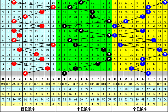 百位分析:最近50期表现较热的号码有:2出现9次,7出现8次,4出现7次;表现较冷的号码有:1、6出现2次,5出现3次。出号奇偶比为23:27,012路比为17:17:16。本期该位绝杀两码0、5,参考号码1、2、4,精选一码4。