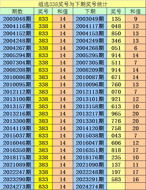 第2024273期3D奖号组选为:338,历史上该号码组选出现24次,下期号码分别为:135、048、850、346、051、914、511、914、671、760、070、921、613、965、776、758、043、606、818、235、137、197、583。
