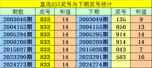 第2024273期3D奖号为:833,历史上该号码直选开出7次,下期号码分别为:135、850、914、914、043、583。