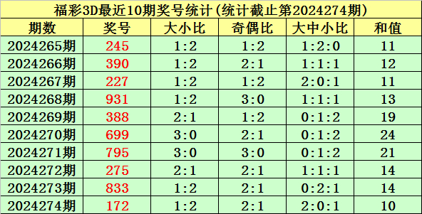 开奖回顾:福彩3D第2024274期奖号为:172。奖号类型为组六,和值为10,奇偶比为2:1,跨度为6,012路比为0:2:1,大小比为1:2。