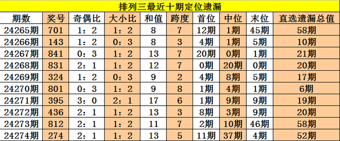 开奖回顾:排列三第2024274期奖号:274,定位直选遗漏值11期、37期、4期,遗漏总值为52期。