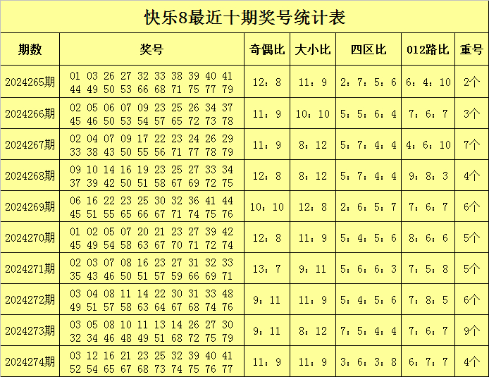 福彩快乐8第2024274期开奖回顾:03 12 16 21 23 25 32 39 40 41 52 54 65 67 68 73 74 75 76 77,其中奖号奇偶比为11:9,大小比为11:9,四区比为3:6:3:8,012路比为6:7:7,重号4个:03、32、68、75。
