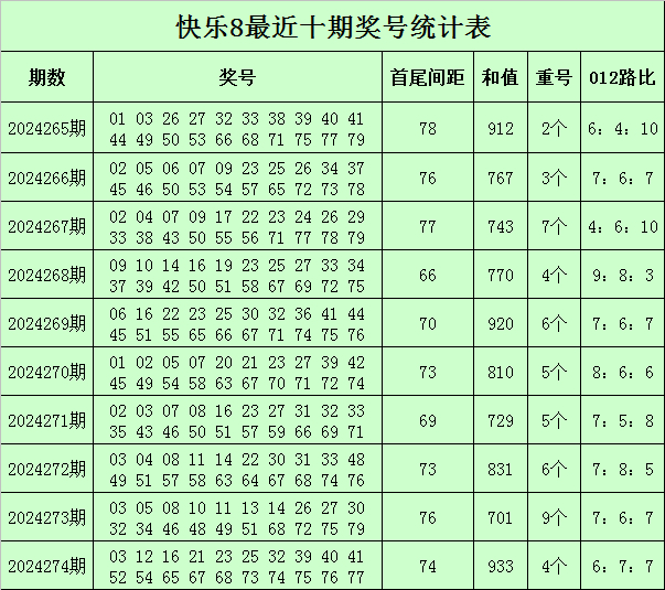 福彩快乐8第2024274期开奖回顾:03 12 16 21 23 25 32 39 40 41 52 54 65 67 68 73 74 75 76 77,其中奖号首尾间距为74,和值为933,012路比为6:7:7,包含7组同尾号码:21-41、12-32-52、03-23-73、54-74、25-65-75、16-76、67-77,开出4个重号:03、32、68、75。