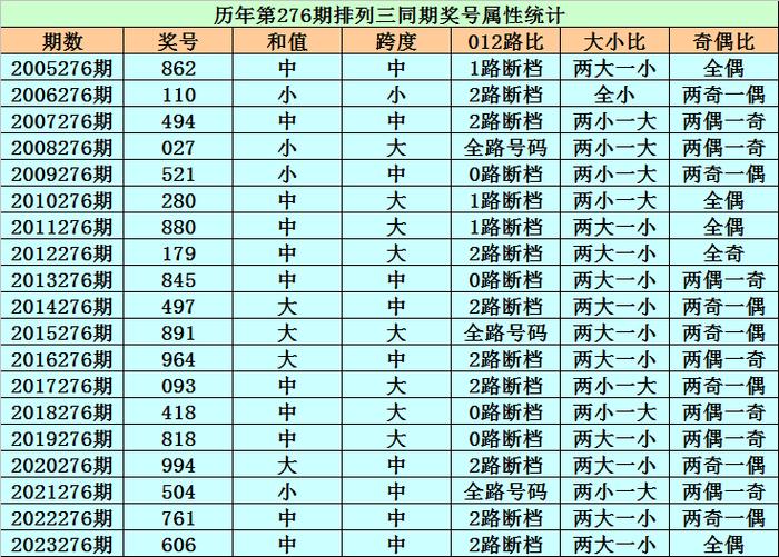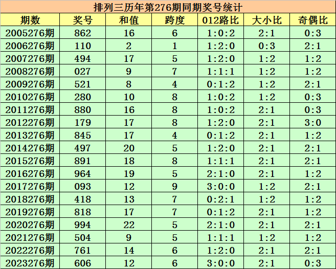 历史上第2024276期排列三已开出19期奖号了,历年同期奖号分别为:862、110、494、027、521、280、880、179、845、497、891、964、093、418、818、994、504、761、606,详细统计见下表: