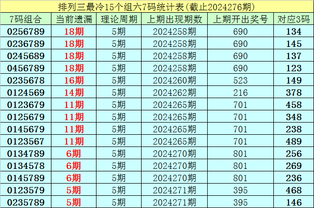 (1)在排列三已开出的7048期奖号中(统计截止第2024276期),目前7码组六遗漏值最大的组合为:0256789、0236789、0245689、0456789,本期遗漏18期;