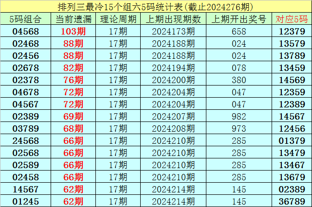 (5)排列三目前遗漏值最大的5码组六组合为:04568,本期遗漏103期,短期解冻的可能性较小,则24277期奖号分布在04568-12379之中的可能性最大。