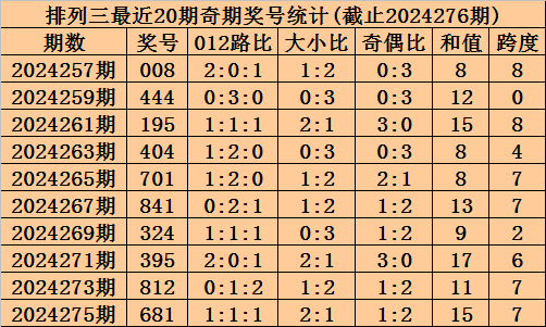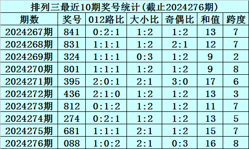 上期回顾:排列三2024276期奖号为088,奇偶比为0:3,大小比为2:1,跨度为16。