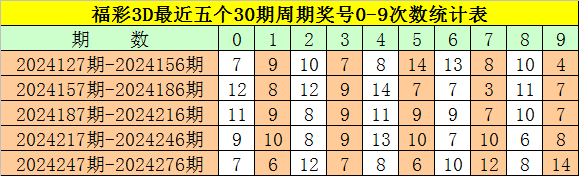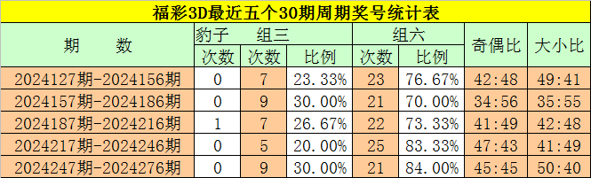 在最近一个30期周期内(第2024247期-第2024276期),豹子奖号没有出现,组三奖号开出了9次,所占比例为36%,组六奖号共出现21期,开出比例为84%,组六号码连续出现3期,表现非常活跃,本期预计奖号为组六号码。