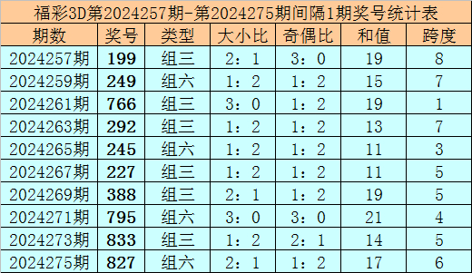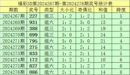 其中大小比2:1,奇偶比0:3,和值14,跨度8。