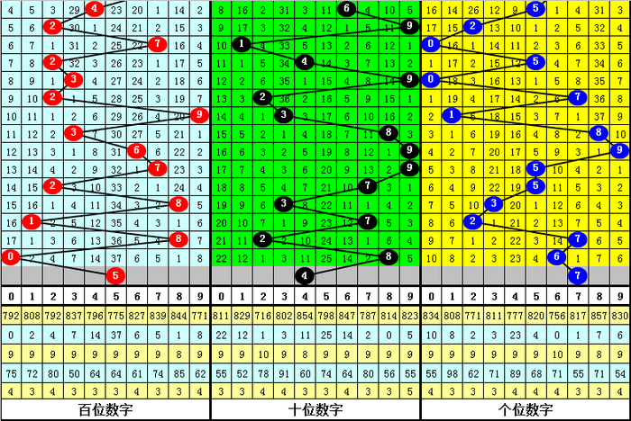 百位分析:上期百位开出奖号:0,最近9期该位奖号大小比为5:4,其中大号8出现2次,6、7、9出现1次,5出现0次,小 号0、1、2、3出现1次,4出现0次,本期百位参考大号,胆码关注5。