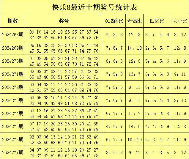 福彩快乐8第2024277期开奖回顾:04 07 09 11 12 16 19 20 25 27 28 37 42 52 60 64 66 69 71 78,其中奖号012路比为8:9:3,四区比为8:4:3:5奇偶比为9:11,大小比为8:12。