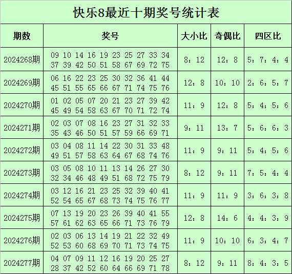 福彩快乐8第2024277期开奖回顾:04 07 09 11 12 16 19 20 25 27 28 37 42 52 60 64 66 69 71 78,其中奖号四区比为8:4:3:5,奇偶比为9:11,大小比为8:12。
