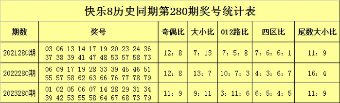 福彩快乐8第2024279期开奖回顾:03 05 09 13 20 23 28 31 32 36 42 43 44 49 63 66 68 69 75 76,其中奖号奇偶比为11:9,大小比为10:10,012路比为8:6:6,四区比为5:5:4:6,和值为795,跨度为73。