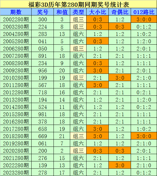 组选类型判断:在第280期历史同期开奖中,组六开出16次,组三开出6次,今年同期看好开出组六号码。