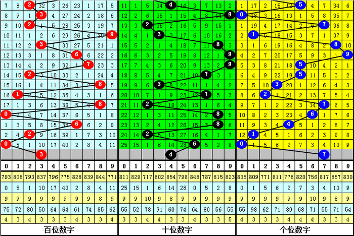 组选分析:在0-9的组选分布图中,最近10期0-2区段开出10个号码,3-6区段开出9个号码,7-9区段开出11个号码,上期7-9区间没有落号,本期看好中后部号码热出,防0-2区段走冷轮空。