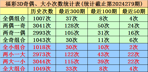 奇偶、大小分析:在最近50期开奖中,全偶组合开出4次,当前遗漏0期、两偶一奇组合开出24次,当前遗漏1期、两奇一偶组合开出16次,当前遗漏5期、全奇组合开出6次,当前遗漏8期,本期注意两奇一偶组合;全小组合出现2期,当前轮空1期、两小一大组合出现22期,当前轮空0期、两大一小组合出现22期,当前轮空2期、全大组合出现4期,当前轮空8期,本期看好开出两小一大组合。