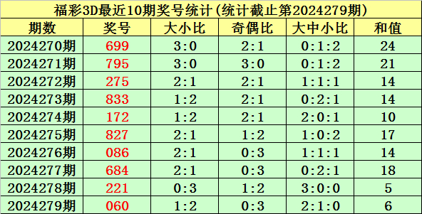 开奖回顾:福彩3D第2024279期奖号为:060。奖号类型为组三,和值为6,奇偶比为0:3,跨度为6,012路比为3:0:0,大小比为1:2。