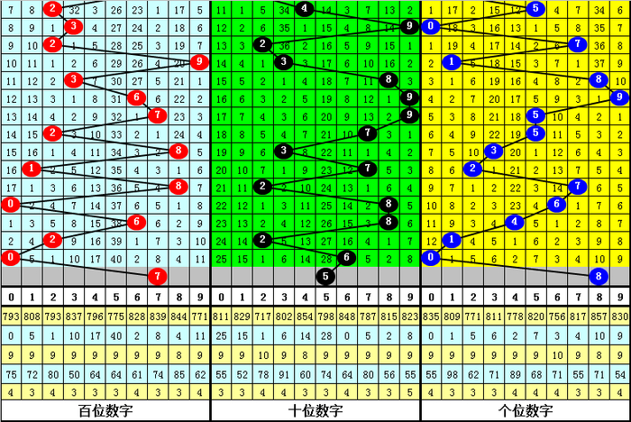 第三位上期开出奖号0,走小1点,本期注意该位走大,关注号码8。