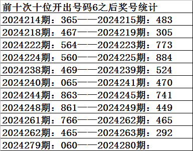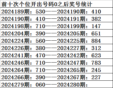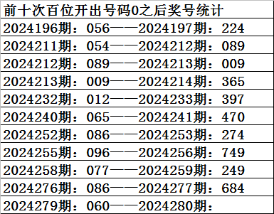 一、上期开奖:福利彩票3D第2024279期奖号为060。奇偶比为0:3,大小比为:1:2,奖号和值为6,奖号跨度为6。
