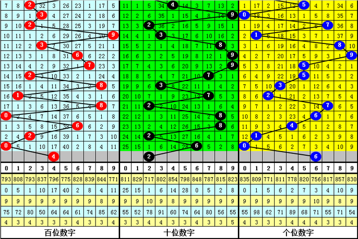 首位跨度分析:首位号码最近3期奖号为6-2-0,连续两期跨度为4、2,历史上首位号码连续两期分别开出跨度4、2的现象共出现168次,其前两次开出奖号分别为: