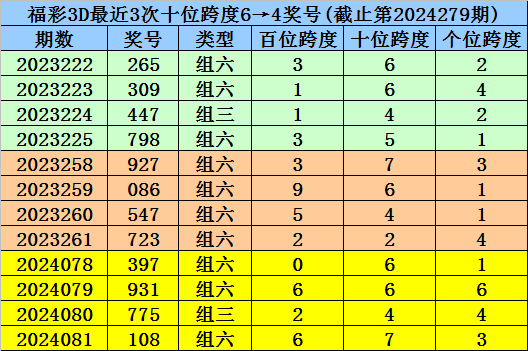 第2024078-第2024080期奖号:397、931、775,其下期奖号为:108,中位号码跨度为6;