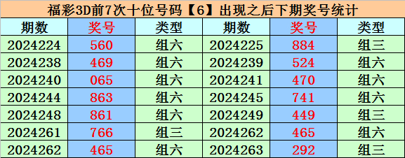 在十位开奖中,号码6前7次出现之后,下期奖号分别为:8、2、7、4、4、6、9,其中奖号奇偶比为2:5,大小比为4:3,012路比为2:3:2。
