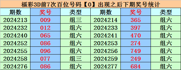 在百位号码0前7次开出之后,其下期分别开出号码:3、3、4、2、7、2、6,其中号码奇偶比为3:4,大小比为2:5,012路比为3:2:2。