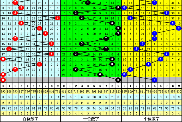 百位分析:百位上期开出号码0,历史上该位号码0出现了793次,最近100期号码0出现次,上期间隔2期再次出现。