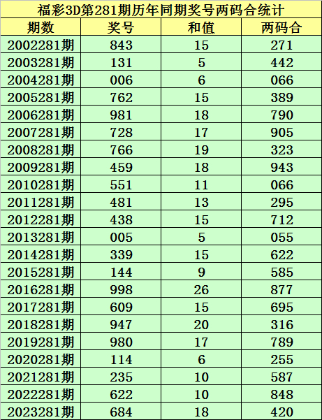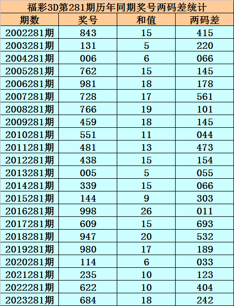 福彩3D第281期,历史上期开出22次奖号,其奖号分别为:843、131、006、762、981、728、766、459、551、481、438、005、339、144、998、609、947、980、114、235、622、684,奖号两码合差分别开出: