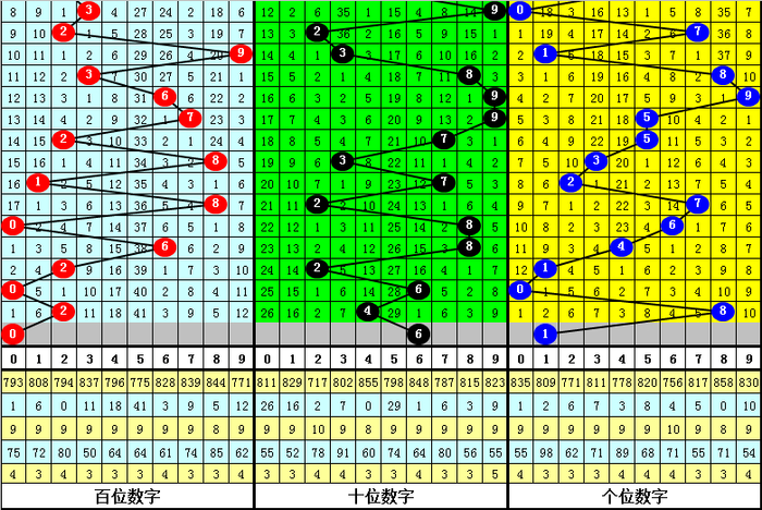 其中两码差0-9开出频次分别为:两码差1开出12次,0、4开出10次,3、5开出8次,2、6开出6次,7、8、9开出2次,其中两码差012路比为26:24:16,奇偶比为32:34,大小比为20:46;