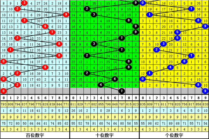 百位分析:该位最近10期开出了3个0路号码、2个1路号码、5个2路号码,2路号码热出,1路号码走冷。本期排除2路号码,参考号码:0。