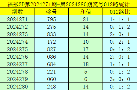 上期回顾:福彩3D第2024280期开出奖号:248。奖号为组六形态,与试机号没有同,奇偶比为0:3,大小比为1:2,012路比为0:1:2,和值为14,跨度为6。