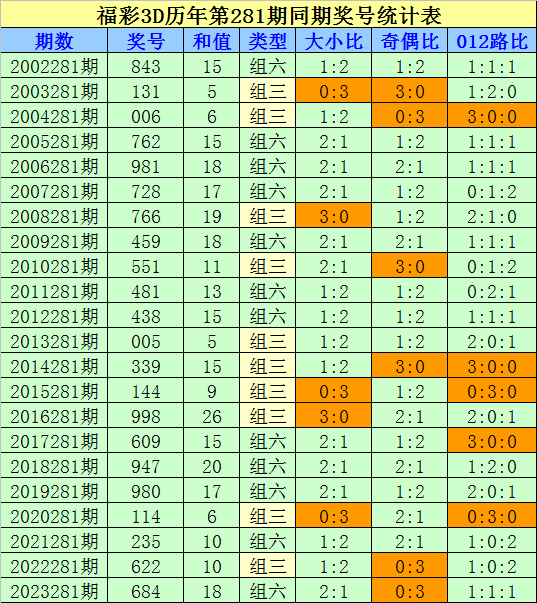 组选类型判断:在第281期历史同期开奖中,组六开出12次,组三开出10次,今年同期看好开出组六号码。
