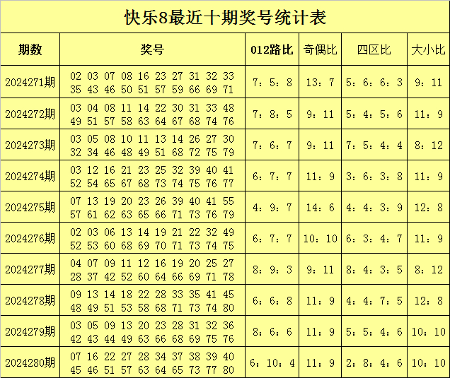 福彩快乐8第2024280期开奖回顾:07 16 22 27 28 34 37 38 39 40 45 46 51 57 63 64 65 73 77 80,其中奖号012路比为6:10:4,四区比为2:8:4:6奇偶比为11:9,大小比为10:10。
