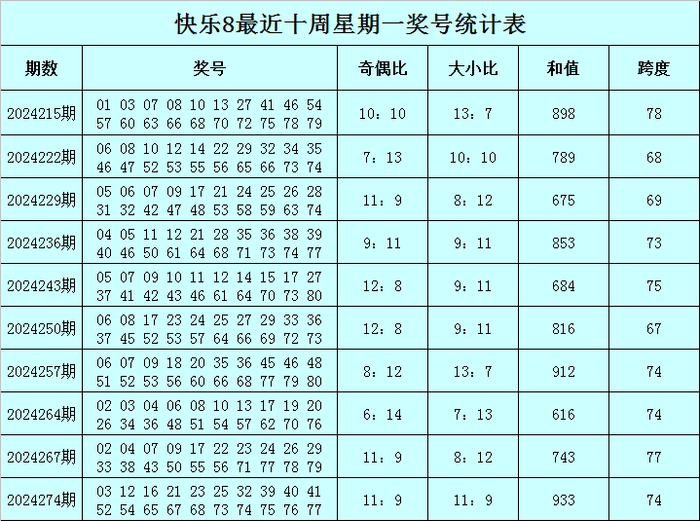福彩快乐8第2024274期(上周一)开奖回顾:03 12 16 21 23 25 32 39 40 41 52 54 65 67 68 73 74 75 76 77,其中奖号和值为933,跨度为74,奇偶比为11:9,大小比为11:9。