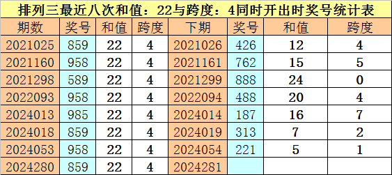 开奖回顾:体彩排列三第2024280期奖号为:859。和值为:22,跨度为:4。