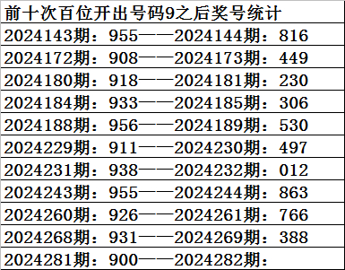 二、百位分析:上期开出号码9,前10次号码9出现之后下期分别开出号码:8423540873,其中号码大小比为4:6,基本相当;奇偶比为4:6,基本持平;012路比为3:3:4,1路号码走温。本期参考号码:4。