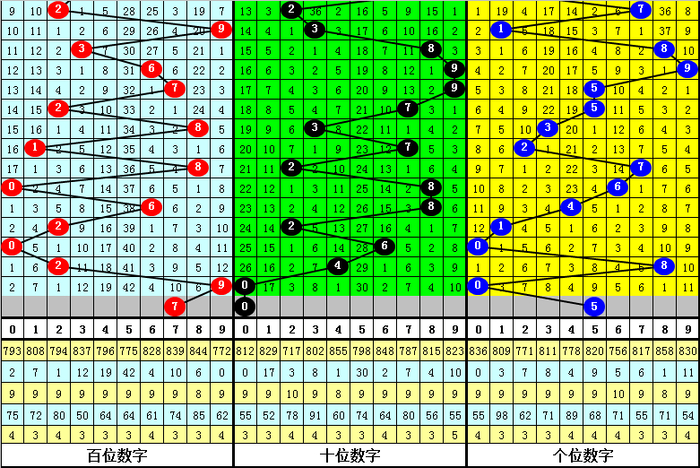 百个位合:前10期百个位两码合开出:7、1、3、5、6、0、3、0、0、9,其中百个位两码合012路比为7:2:1,奇偶比为6:4,本期看好百个位两码合开出2路号,参考两码合2、3、8。