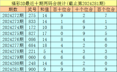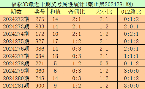 开奖回顾:第2024281期福彩3D奖号为900。奖号形态为组三,大小比为1:2,和值为9,奇偶比为1:2,012路比为3:0:0,跨度为9。