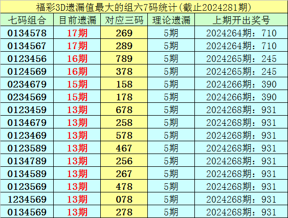 1.截止第24281期,七码组六遗漏最大的是:0134578、0134567,当前遗漏17期。