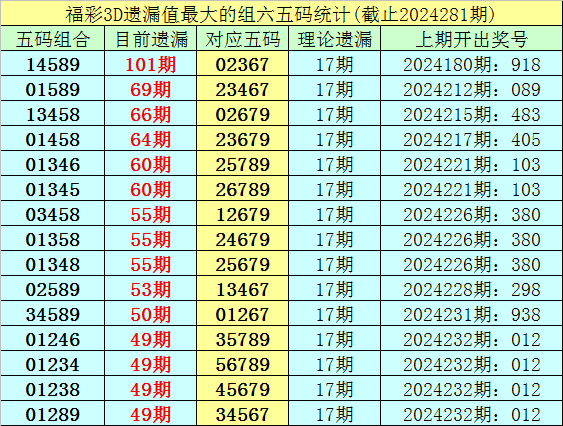 1.截止第24281期,五码组六遗漏最大的是:14589,当前遗漏101期。