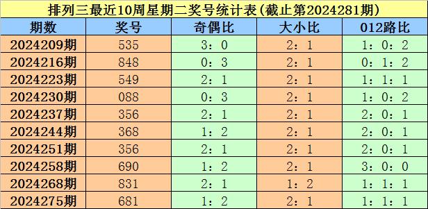 上期回顾:排列三第2024281期奖号为465。其中奖号奇偶比为1:2,大小比为2:1,012路比为1:1:1。