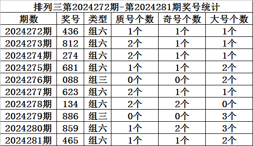 上期回顾:排列三第2024281期开奖:465,质合比为1:2,奇偶比为2:1,大小比为1:2。
