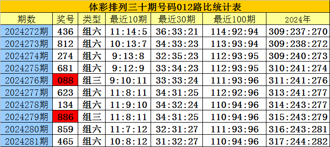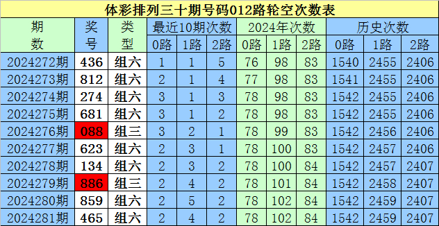 开奖回顾:排列三第2024281期奖号为:465,号码012路比为1:1:1。