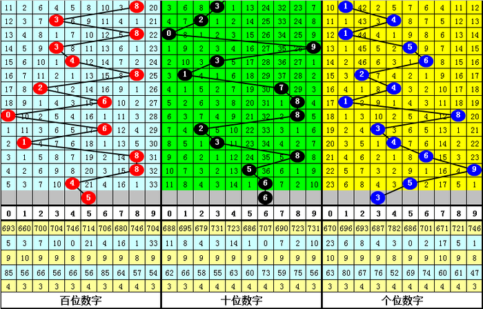 0路号码上期开出1个,近10期共出现10个走势相对较冷,其中0开出1个、3开出3个、6开出5个、9开出1个,本期应注意0路号码回补,参考号码3、6。
