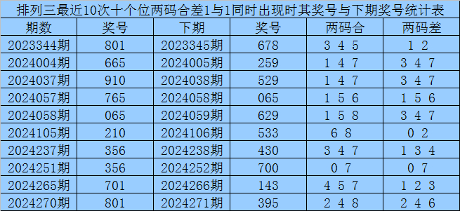 从以上统计可以看出,十个位两码合差1与1同时出现之后其下期两码合差表现最热的4个分别为:1347,本期十个位两码合差可以参考这四码中的数据。