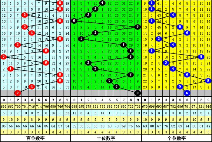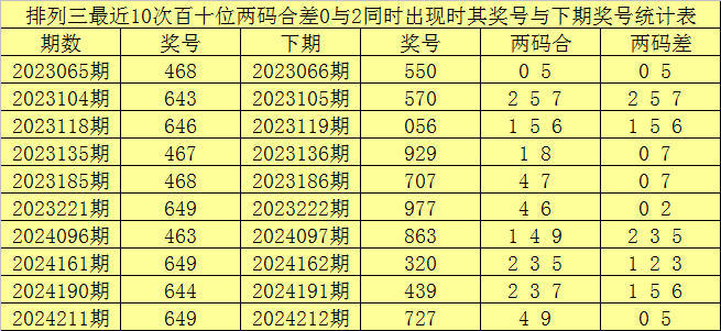 从以上统计可以看出,百十位两码合差0与2同时出现之后其下期两码合差表现最热的4个分别为:1257,本期百十位两码合差可以参考这四码中的数据。