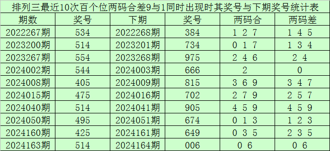 从以上统计可以看出,百个位两码合差9与1同时出现之后其下期两码合差表现最热的4个分别为:0234,本期百个位两码合差可以参考这四码中的数据。