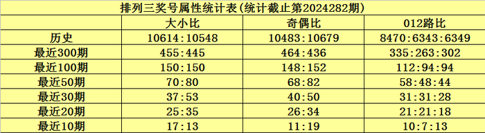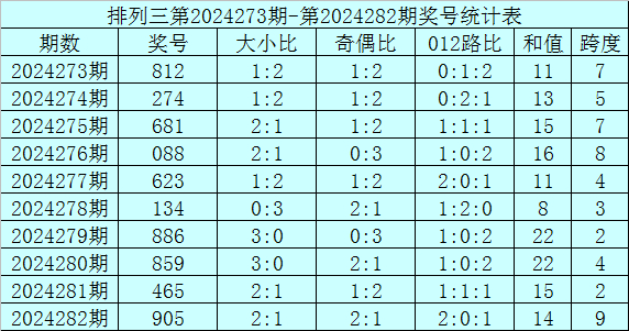上期回顾:排列三第2024282期奖号为905,奖号012路比为2:0:1,奇偶比为2:1,大小比为2:1,和值为14,跨度为9。